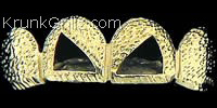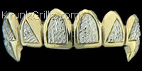 The finest 10k, 14k, 18k and 24k pure gold grillz. You can choose from gold, silver or platinum with any of our designs or draw your own custom grillz style. Each grillz is available in top or bottom row of teeth and can be made in white gold, yellow gold, rose gold. Options include extended fangs, deep cut (perm look), real diamonds, cubic zirconia, gemstones, cutouts (open face), diamond cuts and diamond dust. Starting price for 4 teeth, click a grillz for options.